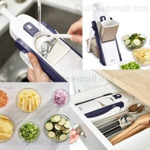 آلة تقطيع الماندولين الخاصة بنا تتميز باحدث التقنيات و الخصائص المتقدمة في الاستعمالات المنزلية بالضافة الى معيار عال من السلامة والتنوع الغير مسبوق في تقطيع الخضر و لفواكه ، مع شفرات من الفولاذ المقاوم للصدأ مخفية تمامًا.