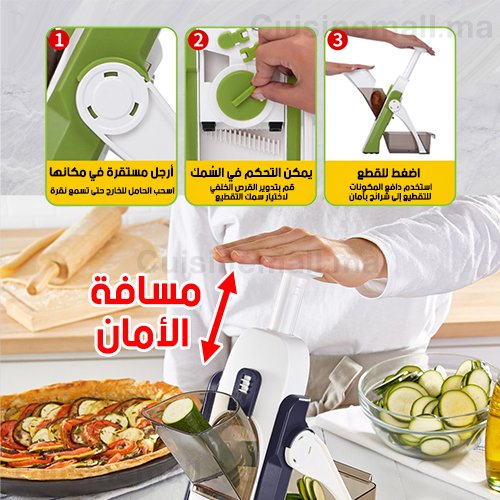 آلة تقطيع ماندولين الخاصة بنا قابلة للتعديل وآمنة، لن تحتاج بعد اليوم إلى تغيير الشفرات في كل مرة، يمكنك فعل ذالك بآمان، فقط عن طريق تدوير المنظمين والضغط على المقبض.مصممة لإبقاء اليدين والأصابع بعيدًا عن الشفرات ، (لذلك من السهل حتى لأطفالك استخدامه)