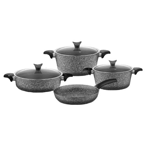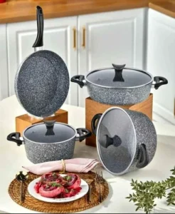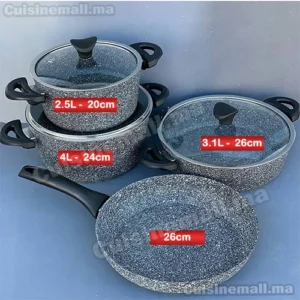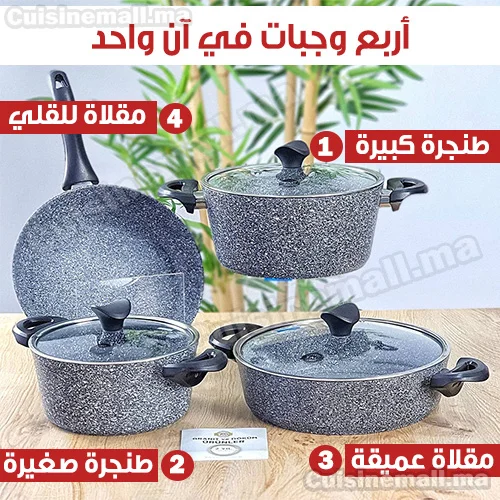 مجموعة أدوات الطبخ المكونة من 4 قطع: طنجرة كبيرة، طنجرة صغيرة، مقلاة عميقة ومقلاة للقلي. تتيح لك طبخ عدة وجبات في آن واحد، كما أن سطحها الڭرانيتي سيمكن من تسريع وقت الطهي مع الحفاظ على نكهة الطعام ومقوماته الصحية.