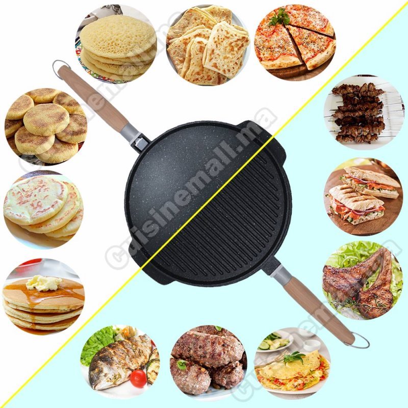 الجهة الأولى لشواء جميع انواع اللحوم، الأسماك أو الخضر، يمكن إستعمالها كشواية أو إدخالها للفرن بفضل اليد القابلة للفك، أما الجهة الثانية، فيمكنك ٱستعمالها لتحضير الخبز والبطبوط، البغرير، المسمن والحرشة، ورقة البسطيلة، والبيتزا.