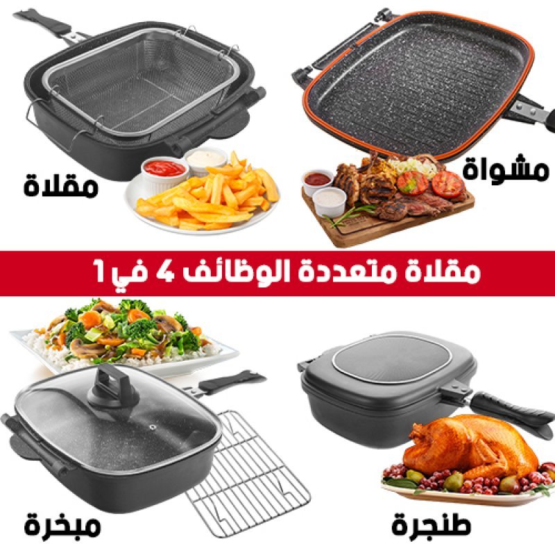 مقلاة متعددة الوظائف مزدوجة الجوانب تحتوي على قدر كبير الحجم و شواية لطهي اشهى الوجبات بسرعة وبدون مجهود. الجوانب قابلة للفصل تماما لاٱستعمالها كطنجرة، قلاية زيت أو مبخرة للأسماك واللحوم.