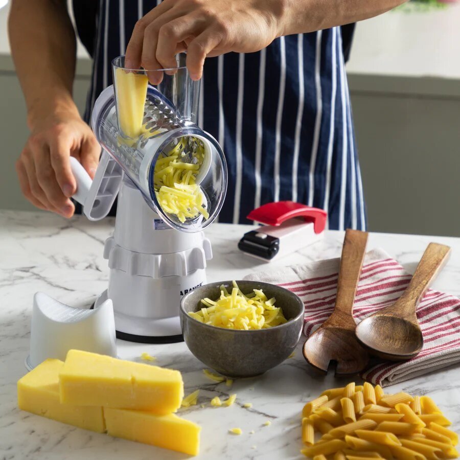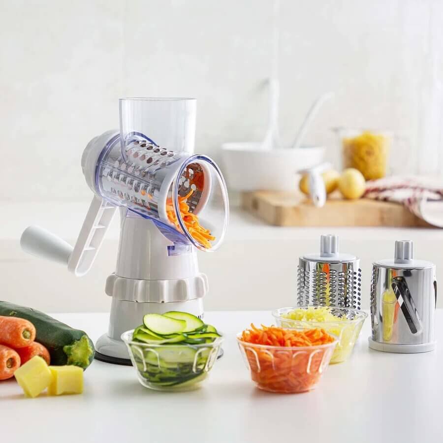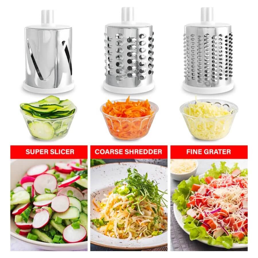 Un hachoir polyvalent qui permet de gagner du temps avec un cylindre rotatif et des lames qui permettent de couper et de râper les ingrédients plus rapidement et plus efficacement. Parfait pour les concombres, les carottes, les pommes de terre, les oignons, l’ail, la chapelure, le fromage, le chocolat, les noix et même les cacahuètes.